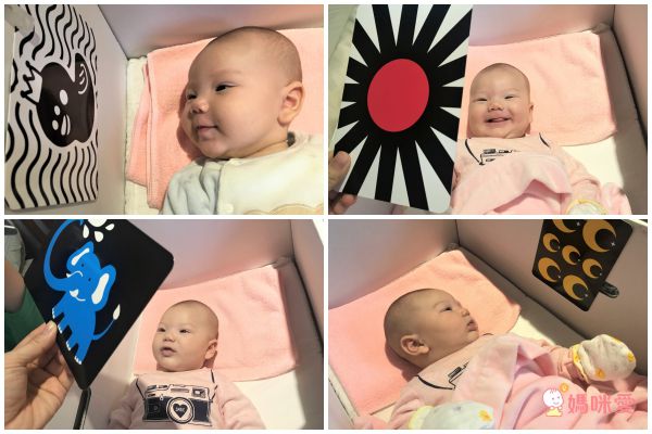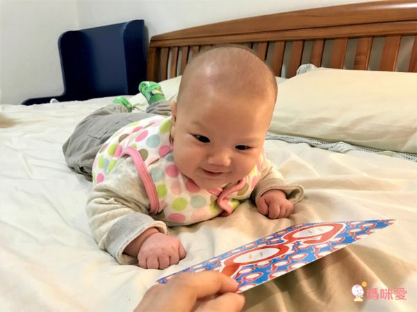 看到什麼圖案這麼開心呢?是紅色的圓眼鏡!當寶寶趴在床上的時候,也可以拿著圖卡左右移動,訓練他的追焦能力喔!