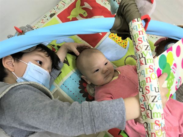 哥哥是很棒的小保姆,陪妹妹躺在床上一起看圖卡,告訴妹妹那是什麼圖案呢^_^