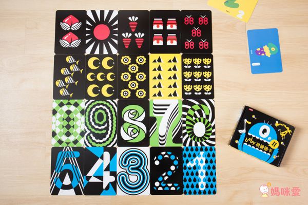 一盒裡面有 20 張,雙面圖案,這次的圖案以對比色刺激幼兒視覺發展,在圖案的設計上也更具巧思耶!有紅蘿蔔、壽桃、星星月亮,看起來有點像小怪獸,而且圖樣融合 1~9 的數字與數量,寶寶到一歲以後也能帶入認知學習,延長圖卡的使用期限!
