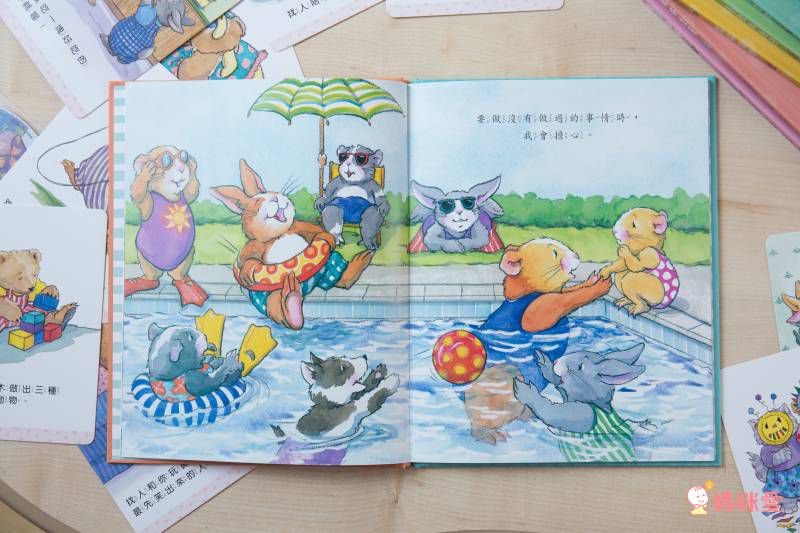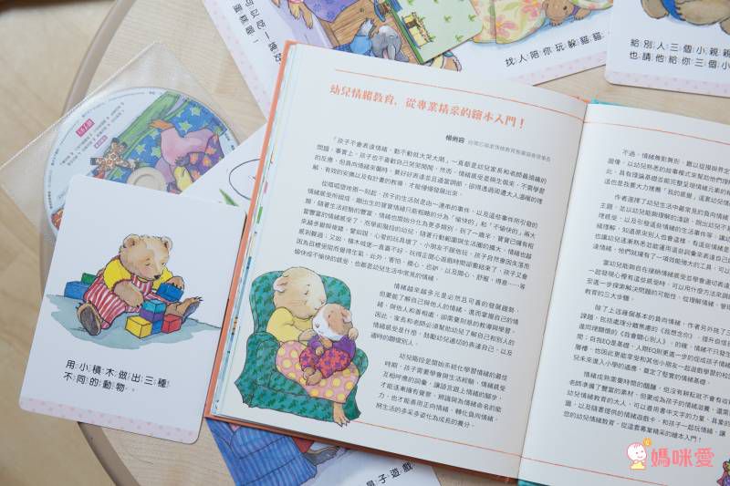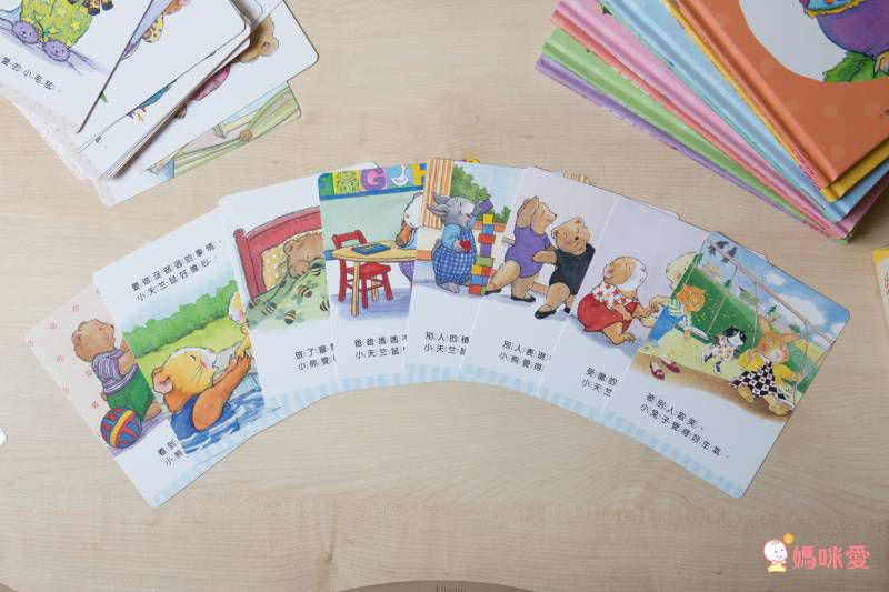 在孩子看完一本情緒繪本故事後,請她從 7 張藍色情緒卡挑出最適合剛剛看的那本的主題,這個步驟可以訓練寶寶理解剛剛故事的內容。然後由陪讀的媽咪從 25 張狀況卡裡選 3 張可以對應這個情緒的處理卡片,詢問寶寶:「遇到這樣的狀況,媽咪建議妳有三種方式,妳喜歡哪種方式呢?」經我們的練習,這樣不只能訓練孩子表達意見,也能增進親子互動。