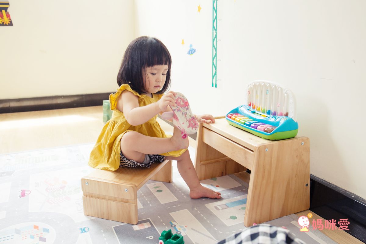 矮凳子非常適合年紀較小的孩子(小檸檬檔案:1Y6M),高度剛好腳穩穩踩在地上~有了舒適的椅子訓練寶貝穿鞋事半功倍!