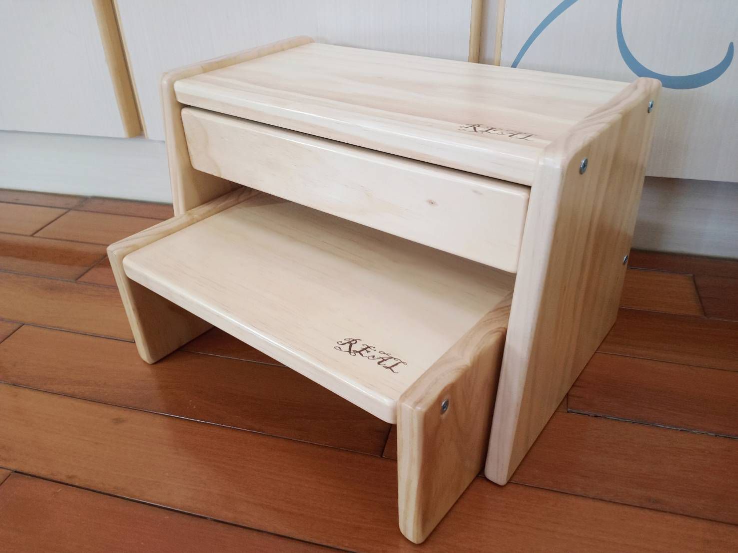 為了孩子的安全,腳凳任何的邊角都有做打磨處理!不會讓孩子被木頭、木屑刺傷喔~ 表面均使用一層水性漆來保護木材,不怕孩子打翻水或塗鴉!輕鬆用濕布就可以擦拭乾淨~實木玩家的高質感真的一看光澤就知道!