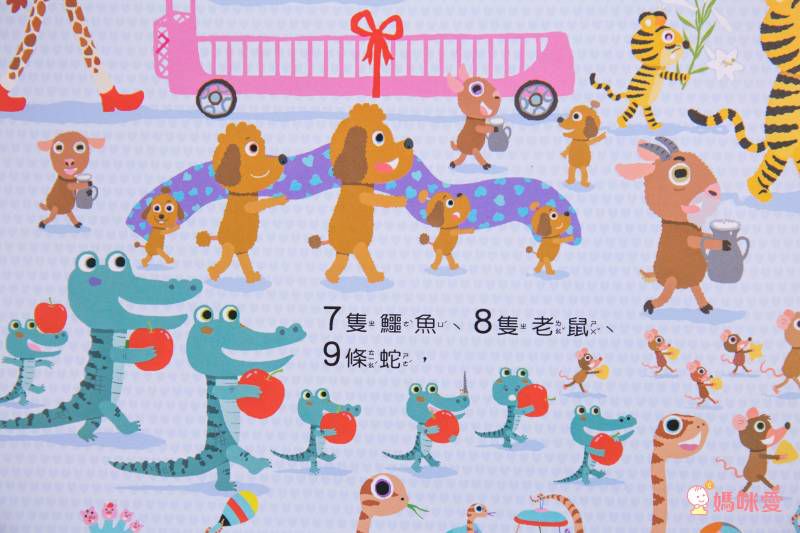 可以看到7隻鱷魚拿著蘋果、8隻可愛的小老鼠~