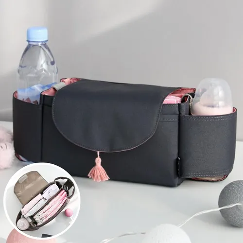 自由調節的置物袋扣環,和任何推車都能搭配。掛在推車上,很方便就可以拿取需要的東西囉!
