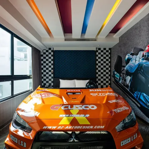 這輛跑車造型的雙人床,實在太酷啦!就連大人也會很想跳上去呢!聽說床尾的車頭是老闆買下正港國外賽車冠軍的賽車,運回台灣重新設計而成,居然可以睡在冠軍跑車上面耶!