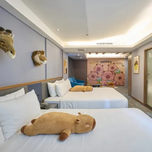 註:本專案為「平日雙人/四人房一泊一食,每房加送卡皮巴拉娃娃(隨機)」,雙人房可選「主題設計雙人房」、四人房可選「豪華四人房或主題設計四人房」。