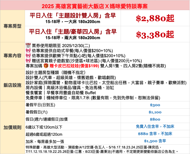 註:平假日定義:平日:一般週日到週五;假日:一般週六/連續假日(連假:端午節5/30-5/3;中秋節10/4-10/5;國慶日10/10-10/11),需加價$800;暑假(7/1-8/31)期間平日加價$300;暑假假日加價$1100。(現場支付)特殊節慶、高雄大型活動、演唱會(4/12世運-告五人,5/16.17.18.23.24.25巨蛋-陳奕迅,7/11.12.15.18.19.22.25.26巨蛋-江蕙,8/23巨蛋-蕭秉治)不適用,不定期更新變動依飯店公告為主。