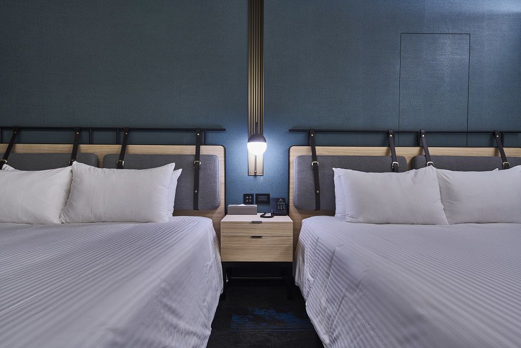 兩張雙人床離得稍遠,也有簡單的隔間隱私,如果是同事一起出差也相當合適。
