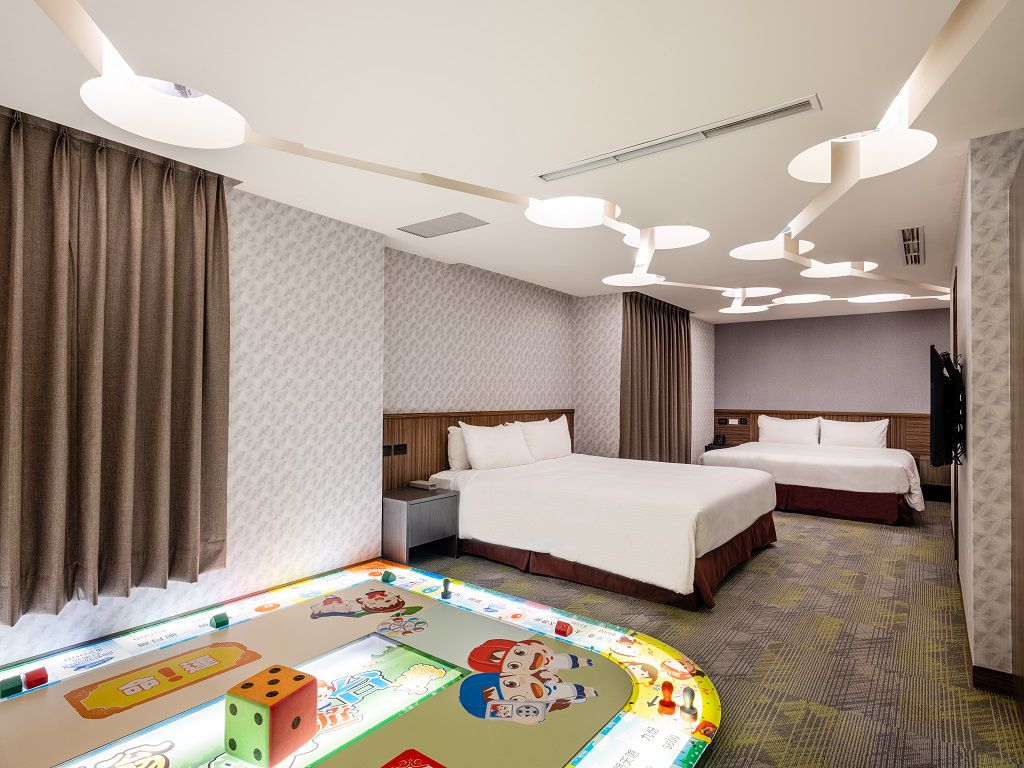 這個很厲害的『大富翁親子房』,一進入房間就讓我們驚呼連連耶~光是這個地圖就整個燃起大富翁魂了!家裡如果有國小、國中兒童的,可不能錯過這間房,晚上大家可以一起玩真人版的大富翁哦!而且遊戲地墊還有燈光,打造電動遊戲的感覺,充滿歡樂的氣氛呀~房間內也有大 Size 的骰子、紙鈔、機會命運卡,各種道具配備一應俱全,對大人來說挺好玩的呢!