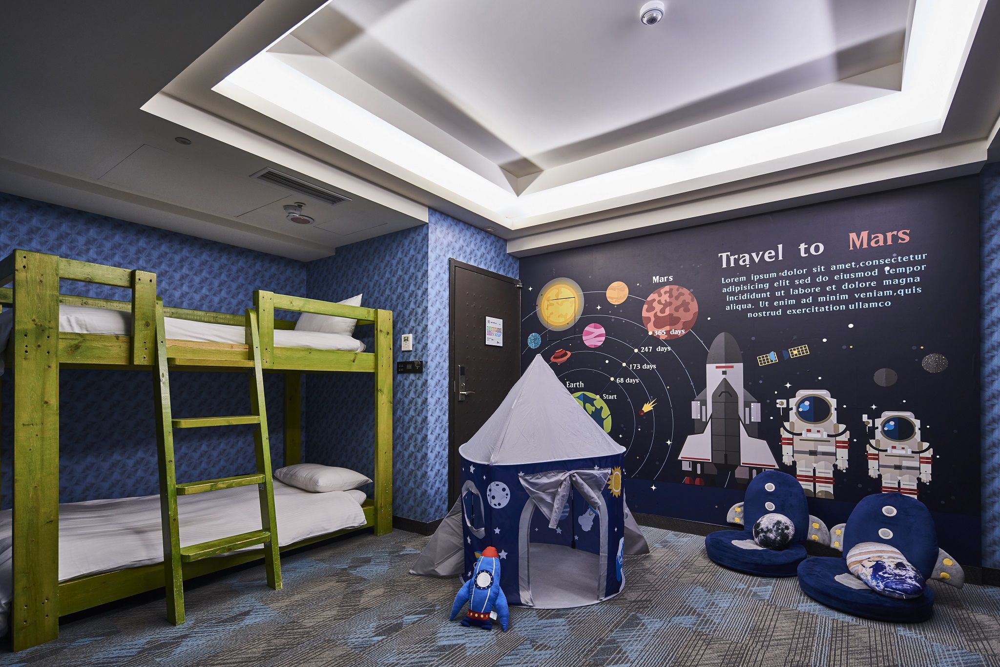 這間太空出任務的主題房,以浩瀚宇宙為整面牆的背景,有宇宙星系、太空人太空船,還有給孩子玩小遊戲屋喔!