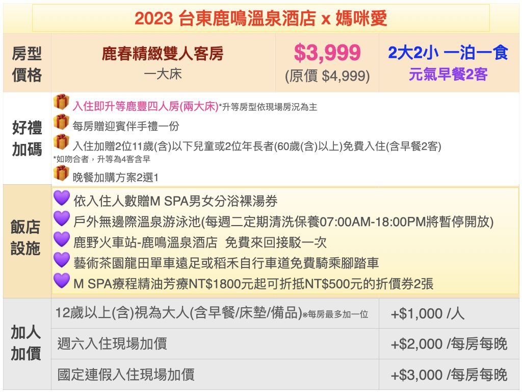 這次方案還有依據入住人數贈送裸湯券哦!就是讓你這一趟泡好泡滿!媽媽們想要更徹底放鬆的話還能使用台東鹿鳴的spa服務,這次開團也有優惠芳療NT$1800起可以折抵NT$500的折價券2張喲