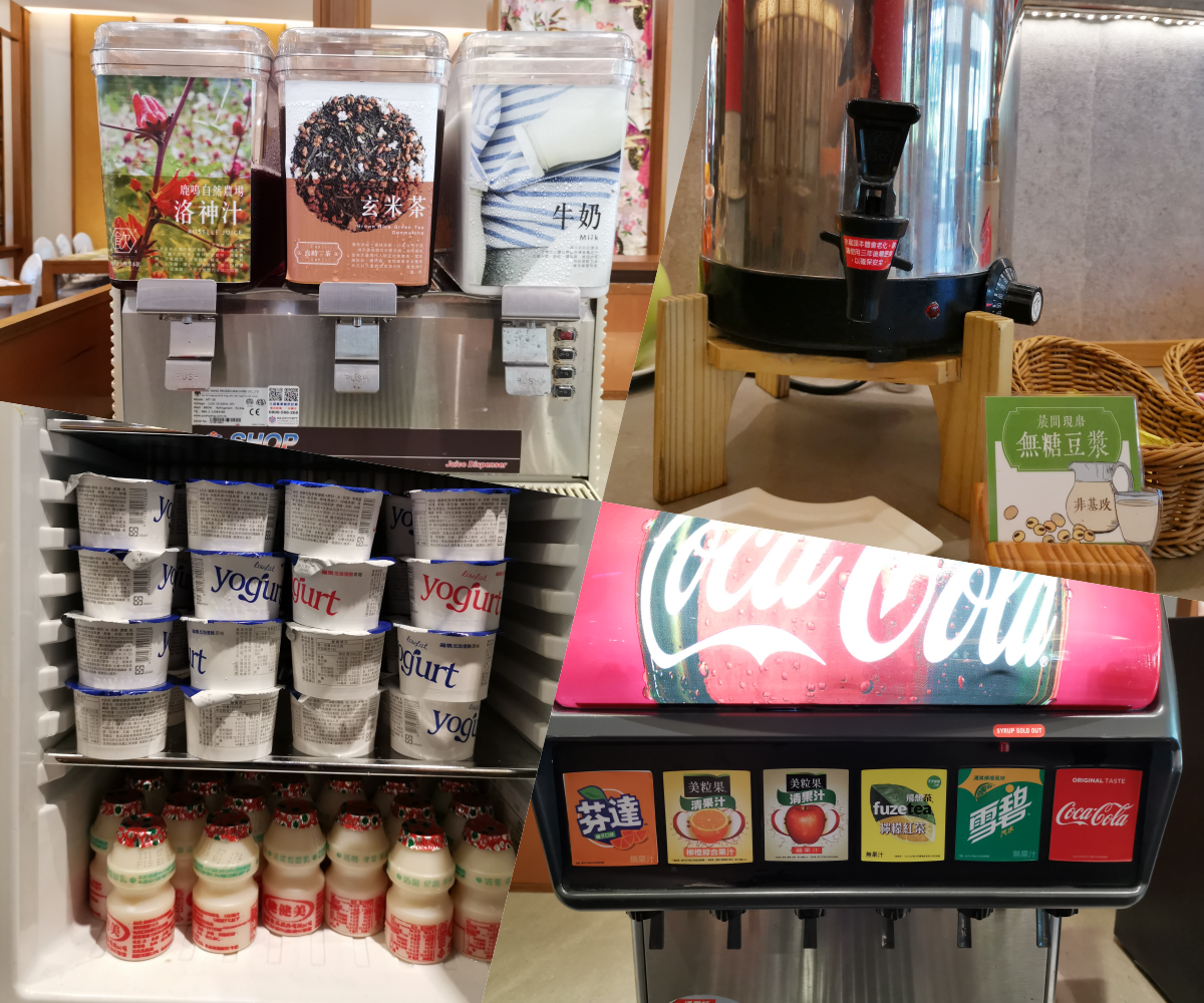 飲料種類超多的!有非常健康的洛神汁、玄米茶、牛奶跟無糖豆漿,飲料機還有各種汽水飲品,大人小孩都可以很滿足的多元化選擇!(餐點內容依飯店現場供應為主)