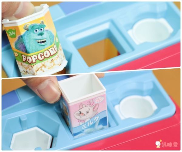 不過他可不是單純的販賣機,既然是為孩子設計的,當然要有些 “學習巧思” 啦!販賣機裡的牛奶、飲料、爆米花、洋芋片等有方形、圓形、六角形不同設計,練習對照投擲時,也能帶寶貝一起認識形狀喔!