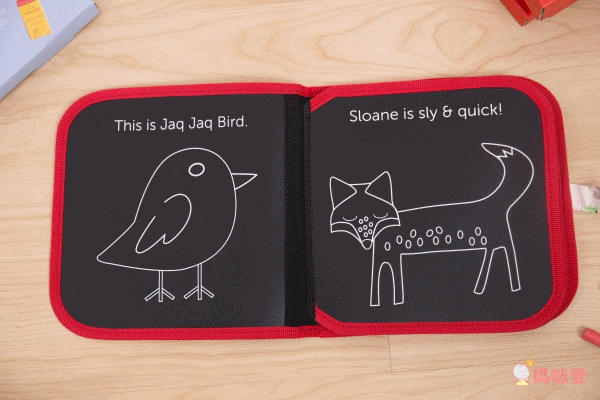 Jaq Jaq Bird 封面的材質觸感很滑順,像在摸絲綢一樣非常舒服!細緻的收邊不用擔心像一般的畫冊太過鋒利而割傷孩子的小手。魔鬼氈的固定帶,讓畫冊不會散開,乍看很像一本美美的精裝書。