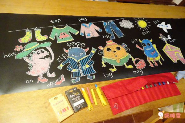 粉筆的筆觸具有濃濃童趣感,我先示範一些可愛的小怪獸吸引孩子動動手,媽咪邊教孩子們畫邊讓孩子們塗色,然後再配上一些最近正在教他們認的單字,真的超級方便!