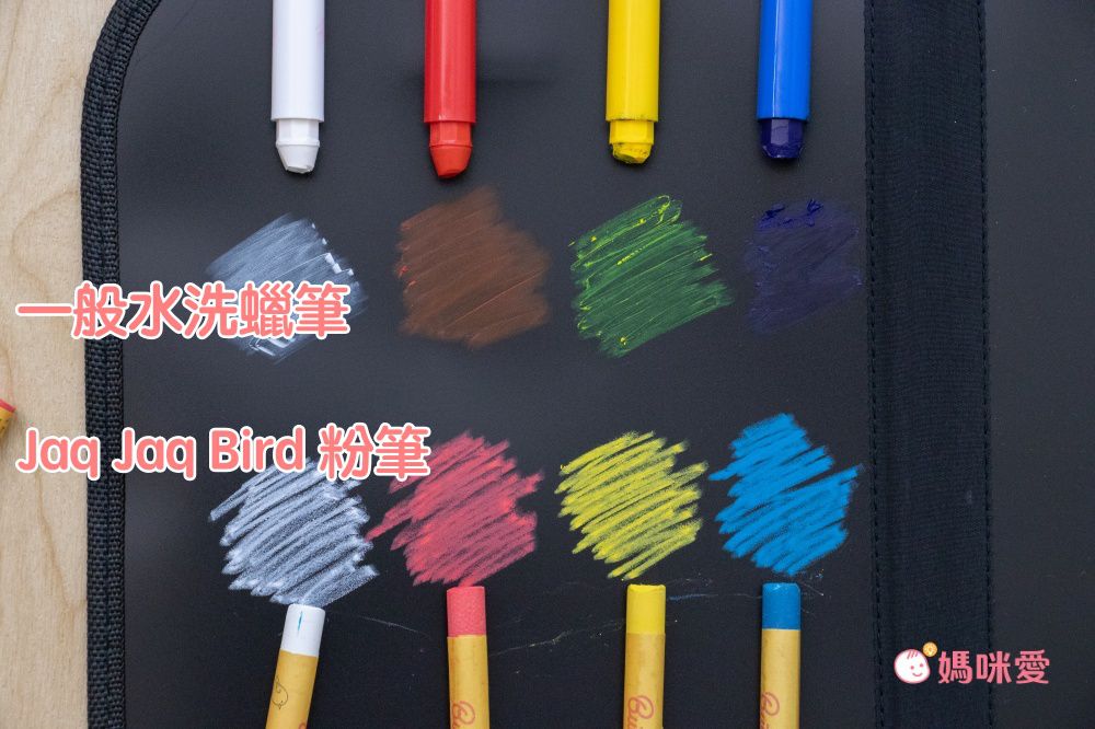 這次用了裡面附的粉筆和水洗蠟筆比較,建議媽咪們可以安心使用「美國Jaq Jaq Bird的粉筆」,無毒無灰超級顯色,濕紙巾就很好擦唷!
