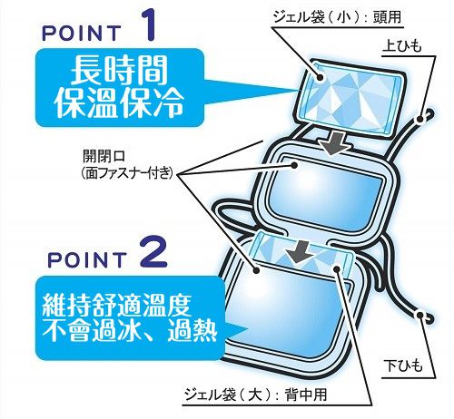 附保冷劑一大一小,小的可置放於頭部,大的可放在背後,從頭到整個背部都涼、涼、涼~