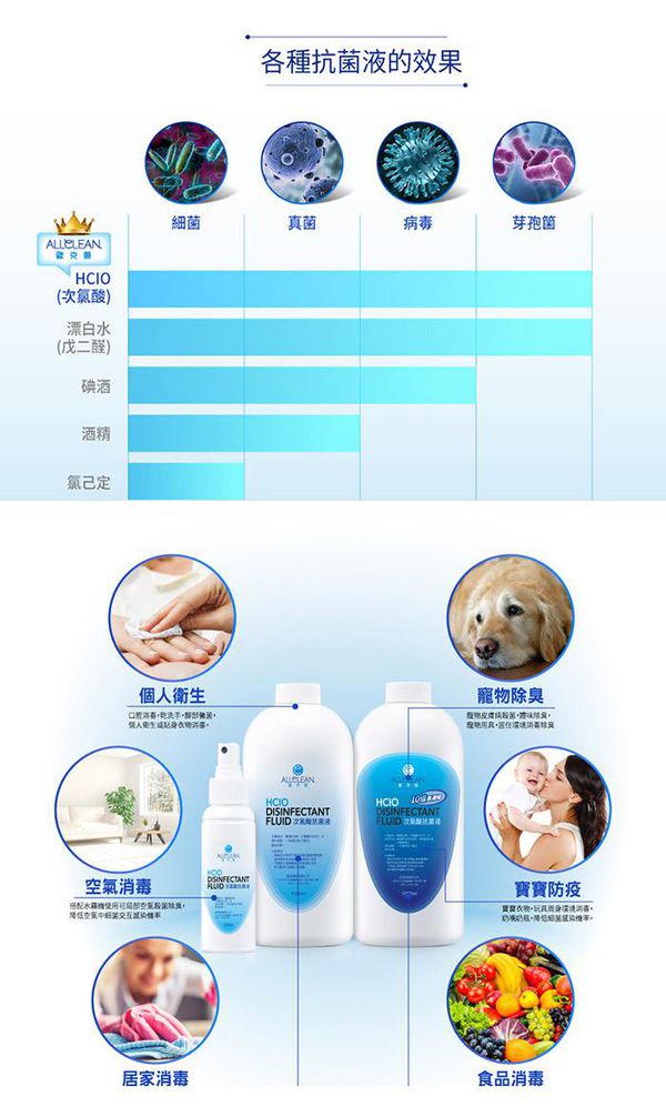 像酒精只對於細菌有效,對於病毒就無法發揮作用呢!雖然漂白水有和歐克靈抗菌液一樣的功效,但成分卻刺激許多喔!除了用在居家環境消毒外,也可用在寵物、食器、食品的消毒上呢!
