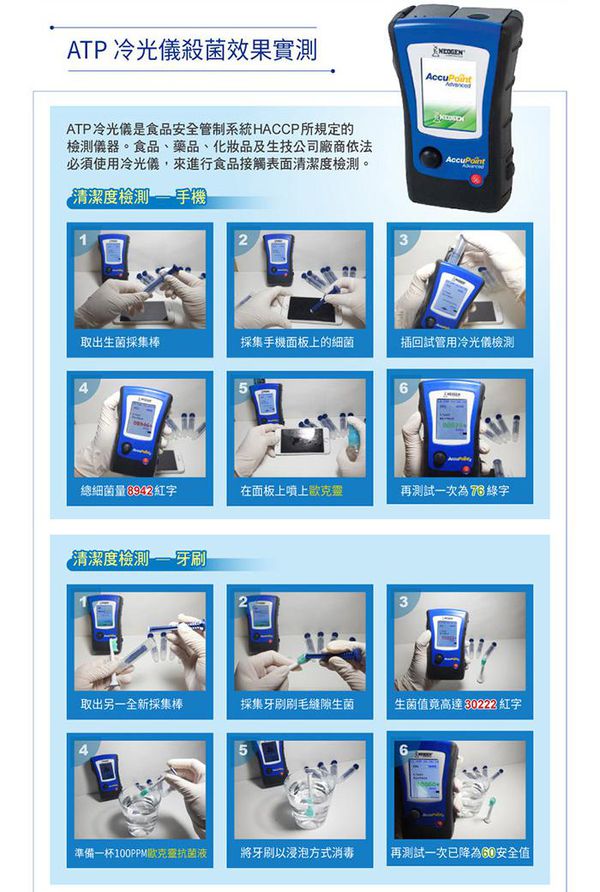 使用ATP冷光儀殺菌效果實測,的確可以看到有效降將病菌量降到最低!