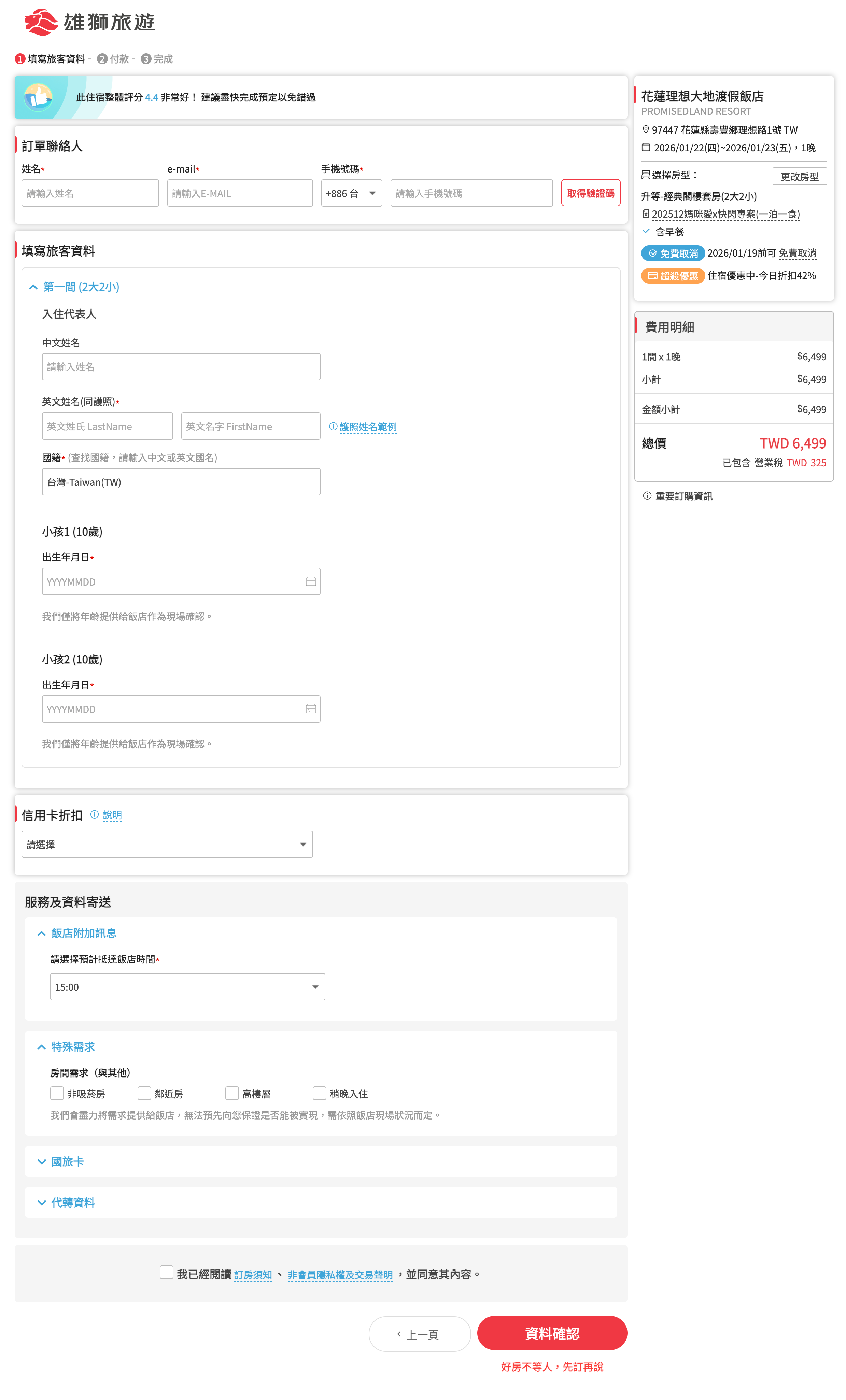 3. 填寫旅客資料、小孩出生日期(現場飯店可能會須核對健保卡資料)與相關特殊需求、是否使用國旅卡後,即可進行付款~
