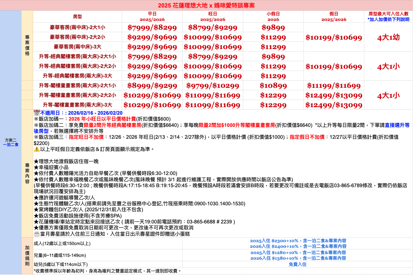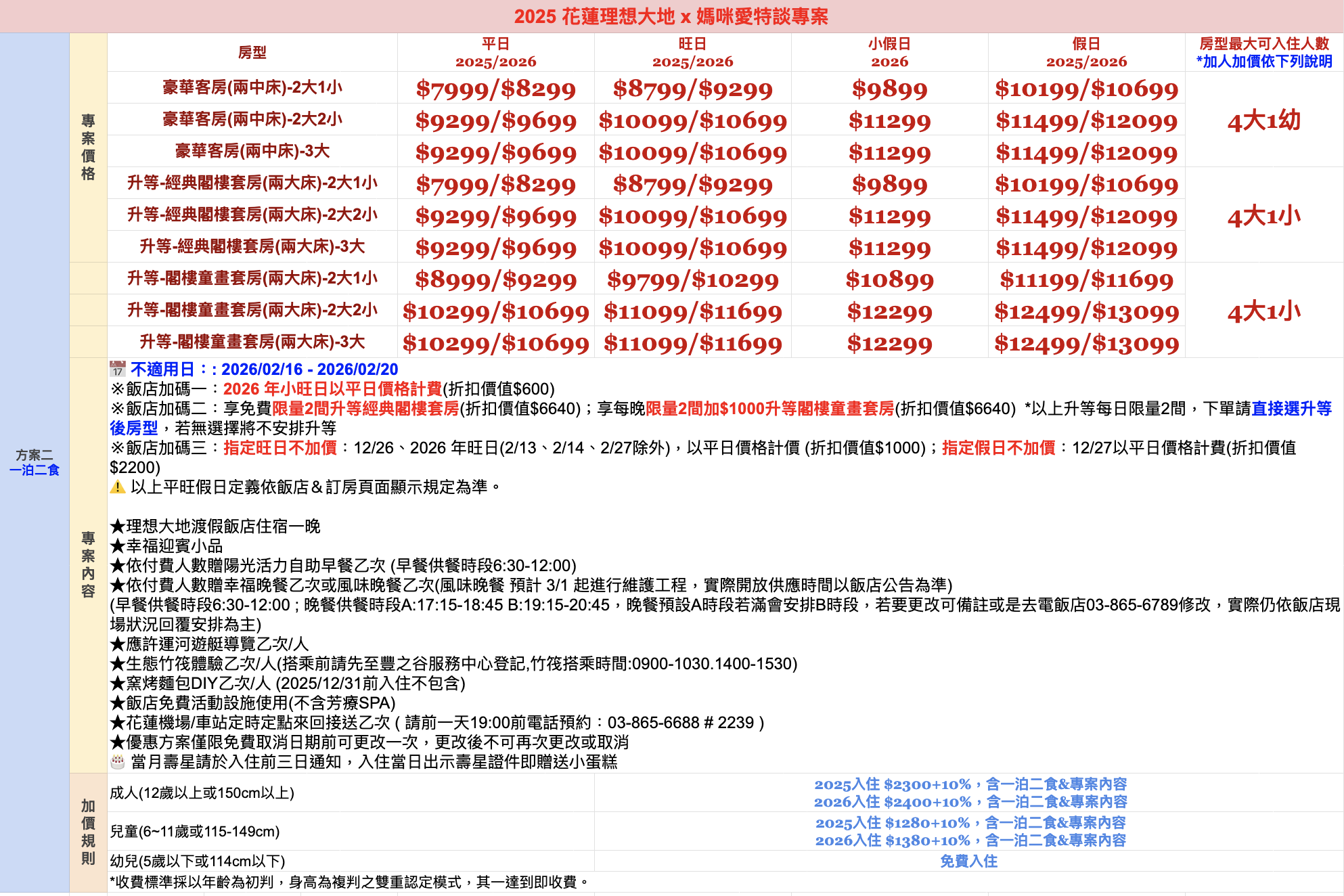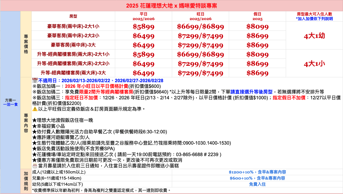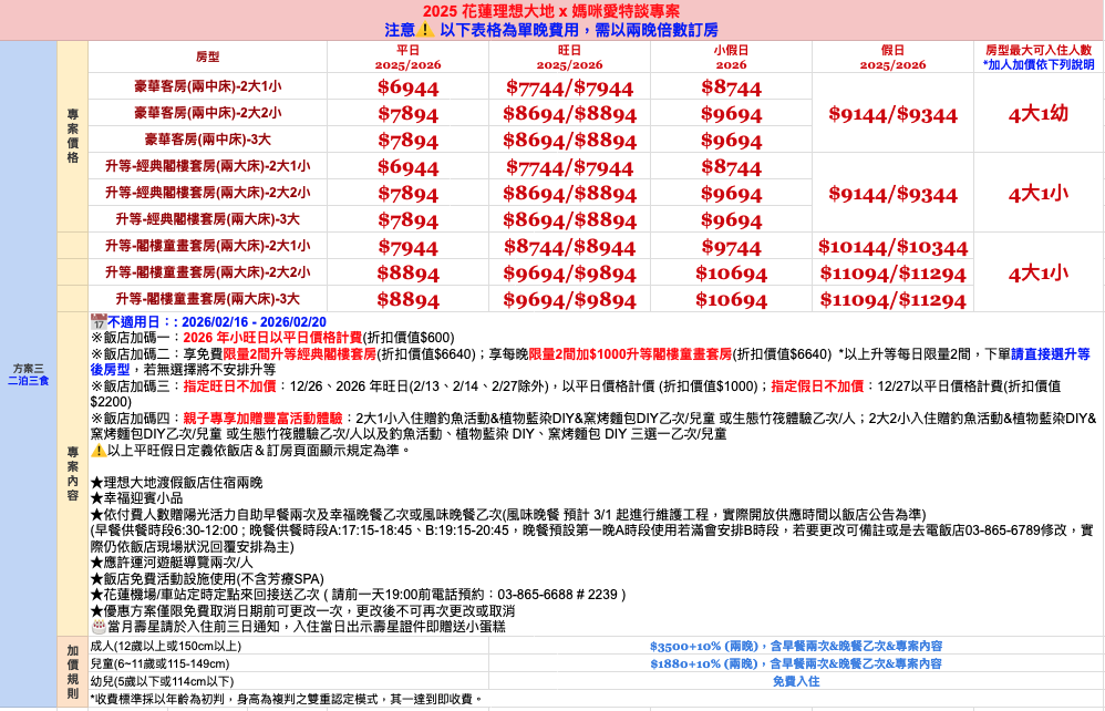 ⚠️ 以下表格為單晚費用,需以兩晚倍數訂房
