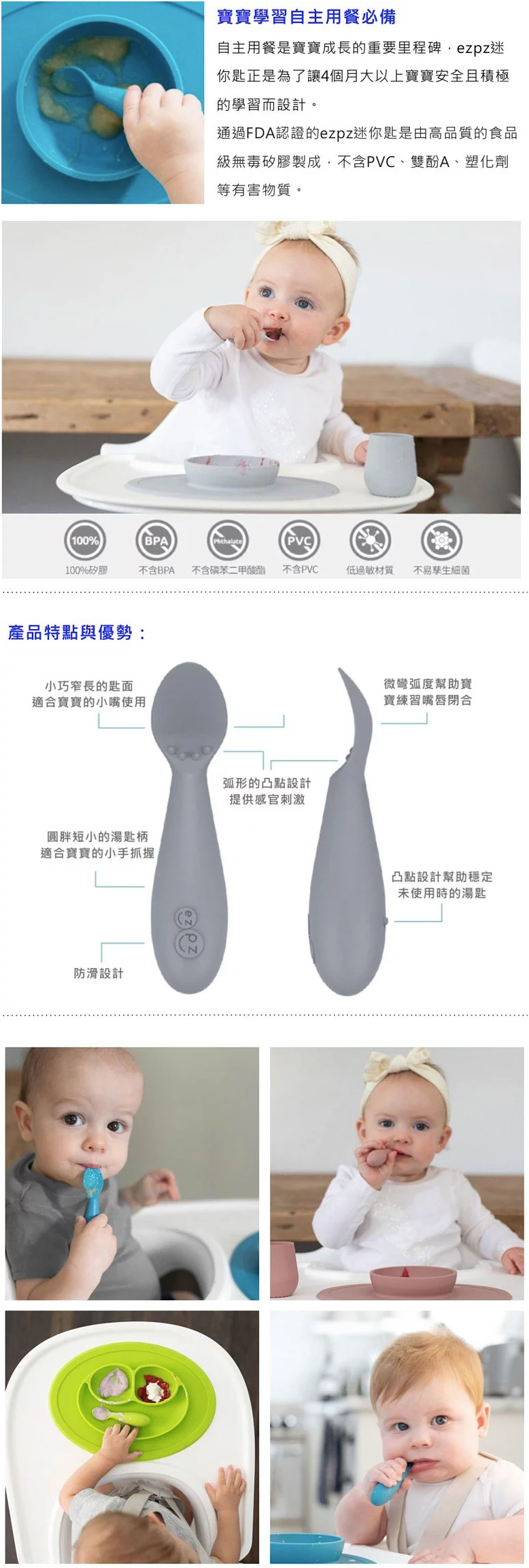 在設計上沒有太多累贅,右下角的 ezpz 商標彷彿兩個笑臉,相當簡約好看 :)) 餐碗的深度較高,適合裝湯水類以防灑出,適合給初嘗試副食品及還在吃粥、泥的寶寶使用!下面整塊大大的長方形,既是餐墊又有吸盤的吸附能力,可以穩定吸附在平面桌子上,防止小孩打翻食物。