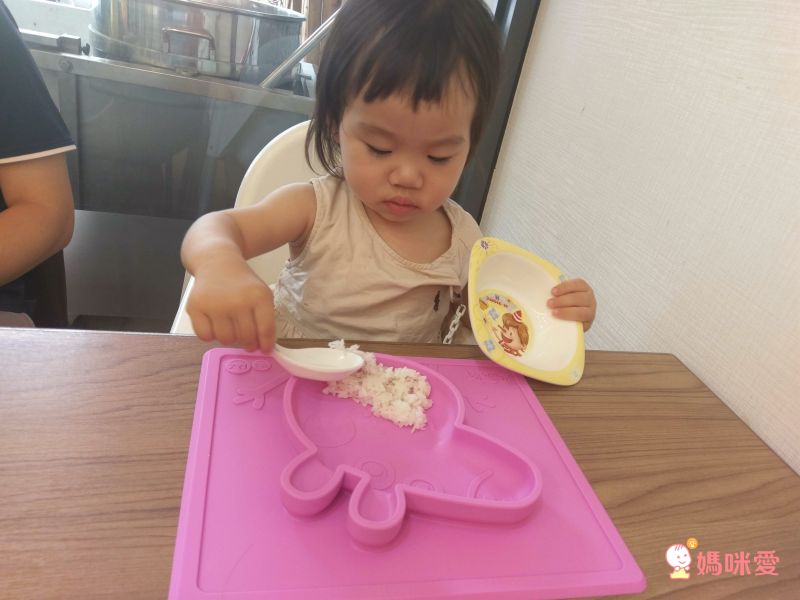 吃起熱食也完全沒有問題,剛滿一歲的龍龍,對著餐碗又用叉子捅、又用手抓,餐碗還是牢牢地釘在桌上。特別是它的餐碗深淺適中,讓龍龍練習自己吃飯更簡單、更有自信。