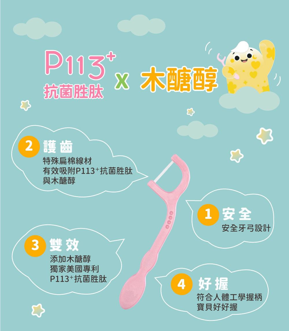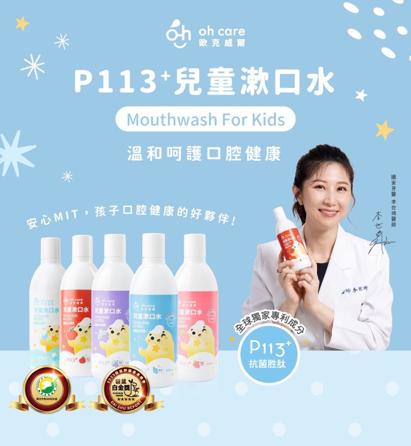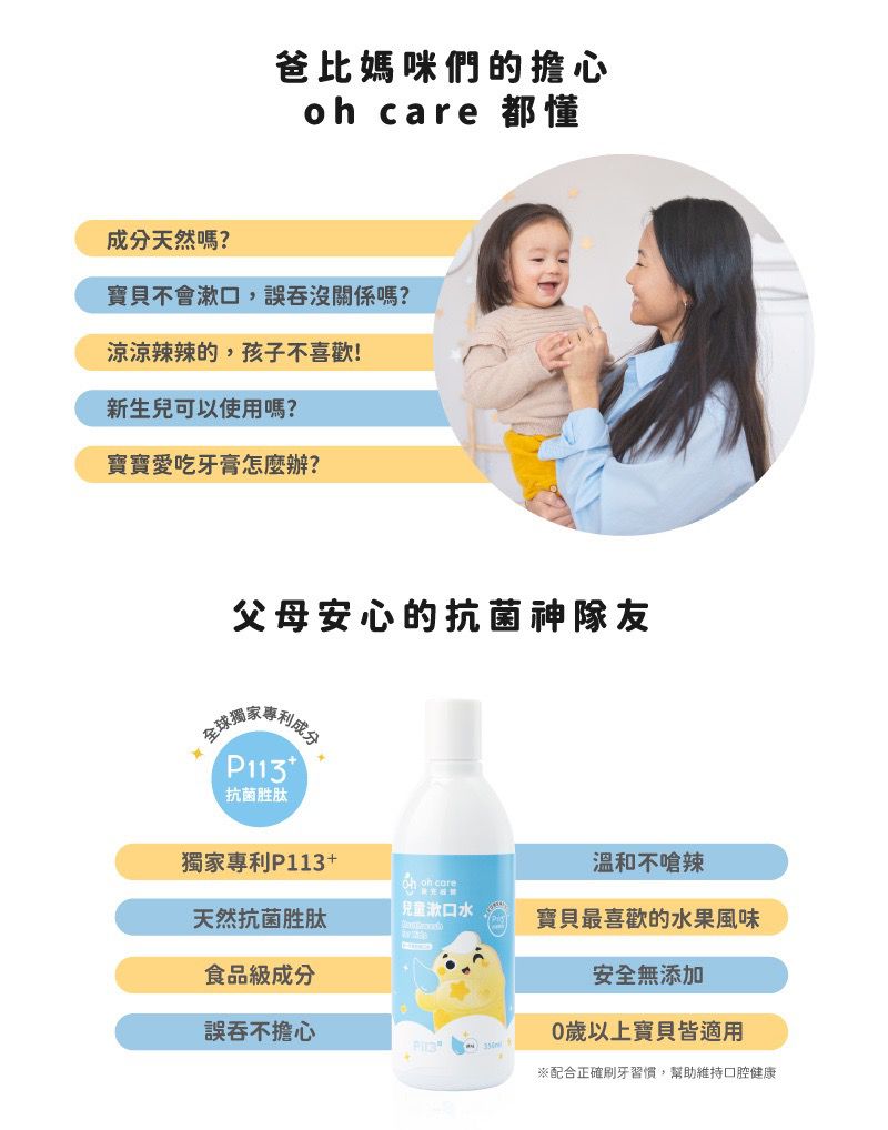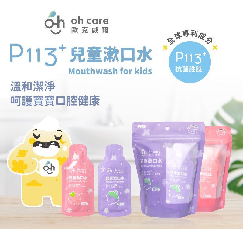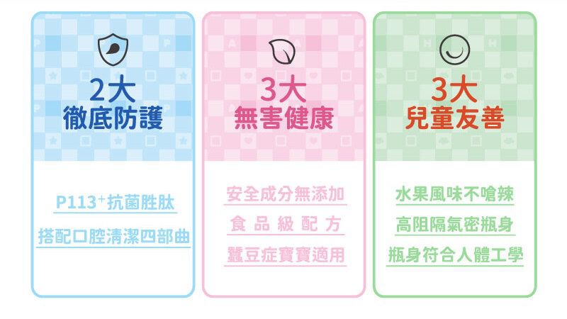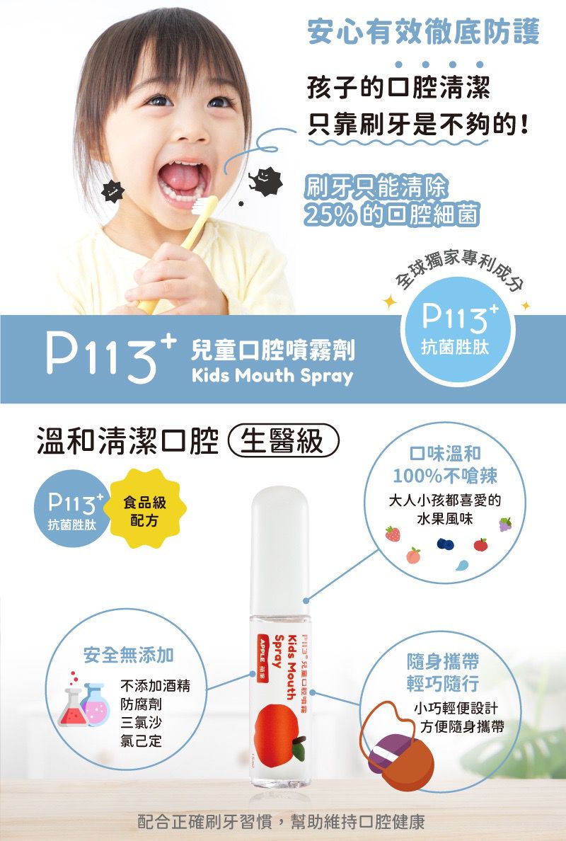 使用全球獨家專利成分 P113+ 抗菌胜肽,溫和不嗆辣,水果風味可提高寶寶接受度。