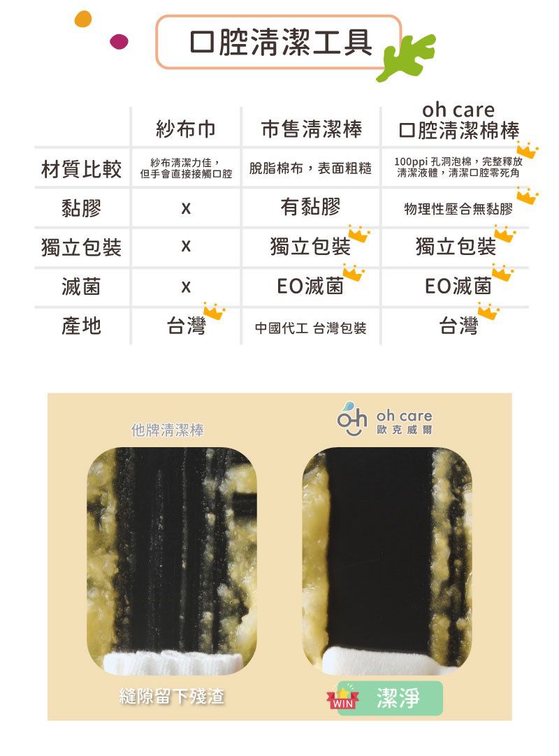 與市面上的口腔清潔工具比較,oh care 歐克威爾 口腔清潔棉棒會受到爸比媽咪喜愛真的不是沒有道理的!