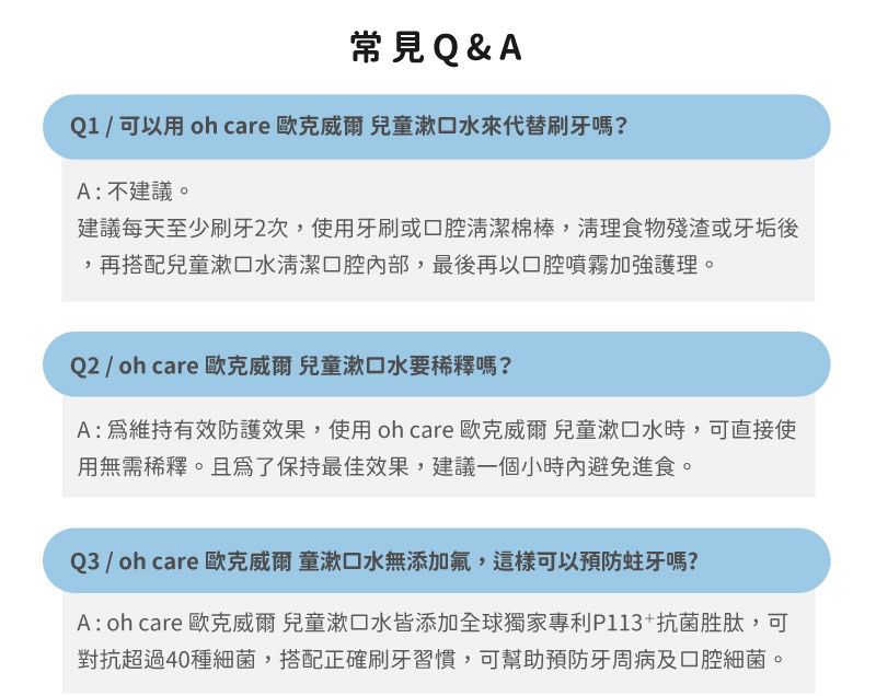 A:配方不同,建議兒童漱口水為刷完牙使用,噴霧劑則可隨身攜帶外出時使用。