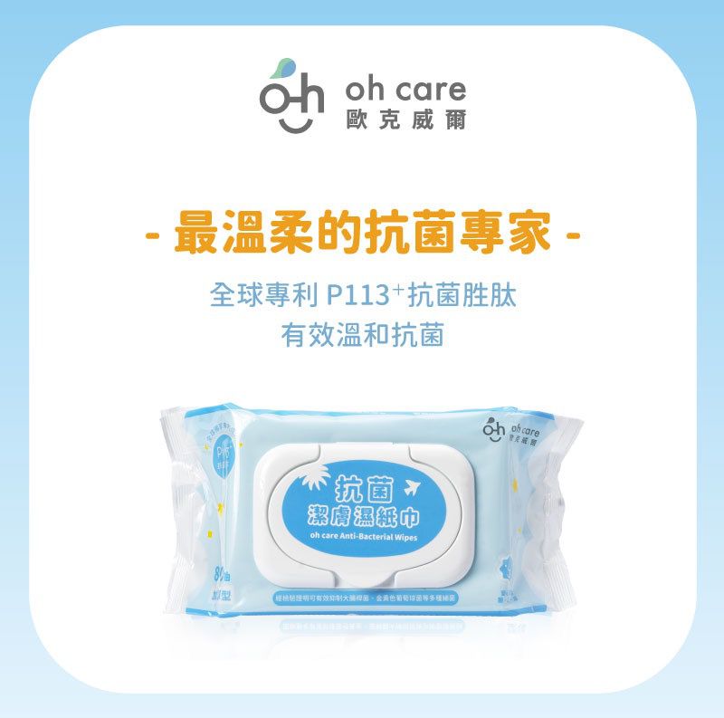 且oh care 濕紙巾也是有添加全球獨家專利P113+抗菌胜肽,取代刺激性的酒精成分,讓爸比媽咪幫寶貝擦拭可以非常安心。