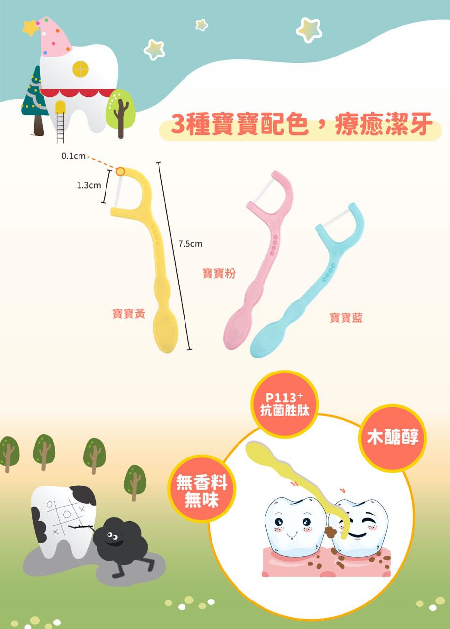 刷牙前建議爸比媽咪可以使用牙線先幫寶貝清潔牙縫的髒污,可以讓刷牙清潔更加倍!