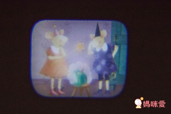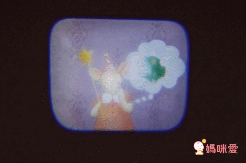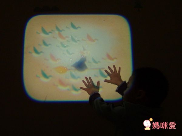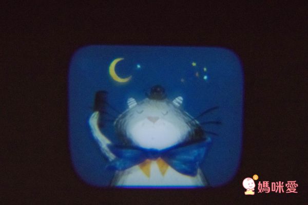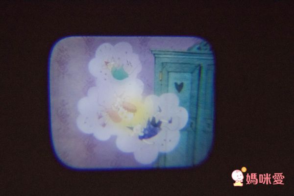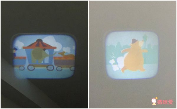 如果媽咪擔心房間全暗小孩會害怕,也可以開一點窗簾讓光透進來(如右圖)即使這樣投影出來的效果還是很清楚;如果燈全關則會像左圖一樣,色彩更好看!