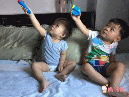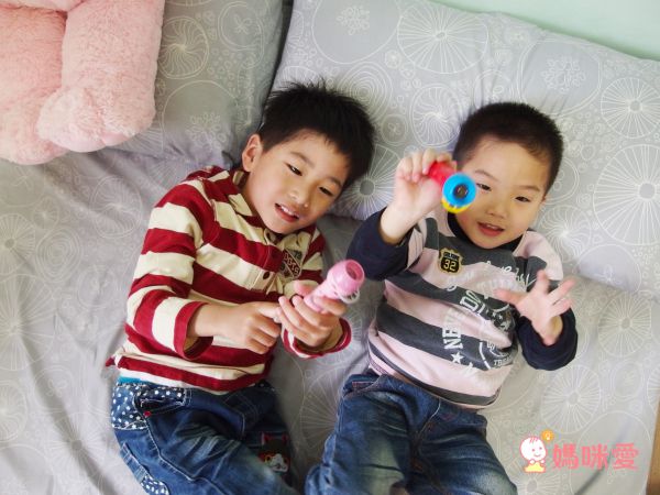 甄甄看到柚子拿著故事手電筒在播放影片,她也想要試試看,所以柚子就把故事手電筒給甄甄,自己拿另一款迷你幻燈片機來播放,兩個孩子一人一台一起播放投影片。