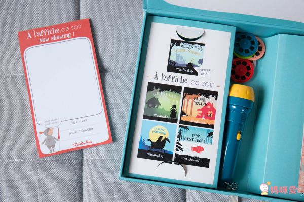 Moulin Roty 故事手電筒劇院組真的就像是一個小小戲院呀!盒裝設計與前面的緞帶很精緻,送禮也相當適合喔~盒子打開來就變出一個屏幕,可以直接將幻燈片投影在上面!