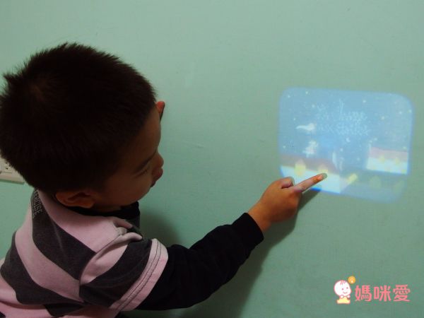 電影要開始放映囉~建議媽咪把燈關得暗暗的,投影出來的效果才會比較好喔!(手電筒前方一樣有可以調整焦距的部分)