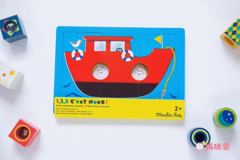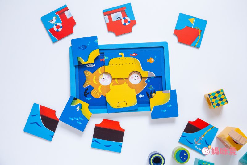 總共有18片拼圖,可以疊成3種不同有趣的情境:紅色漁船、黃色潛水艇以及橘色金魚