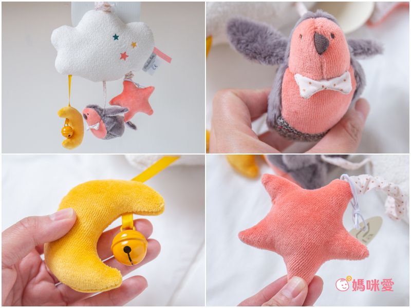 雲朵上有可愛的鳥寶寶,掛著鈴鐺的彎彎月亮,搖晃會有清脆叮噹聲。拉動星星還有輕柔的音樂。