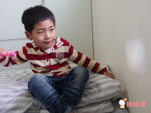 彥哥哥突然發現手電筒距離投射處愈遠,畫面就變大了,覺得很新奇,但要記得將畫面調清楚唷!