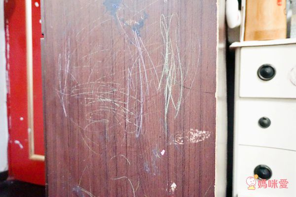 由於孩子太喜歡把家裡當畫布,所以決定讓他們自己收拾善後,即使用在貼皮的木櫃子上,也不會因為擦拭清潔而讓他失去原有的顏色