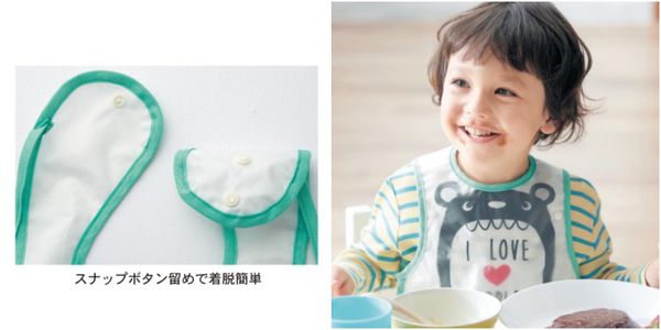 表面是防潑水材質,有時寶寶難免會沾上些醬汁,擦拭方便又容易;裡面是100%棉質,與肌膚接觸的時候很舒服。利用開扣固定好穿脫,像冬天都會給寶貝穿高領保暖衣,有些圍兜兜會讓脖子卡卡不舒服,搭配這種開扣設計就很方便換穿。