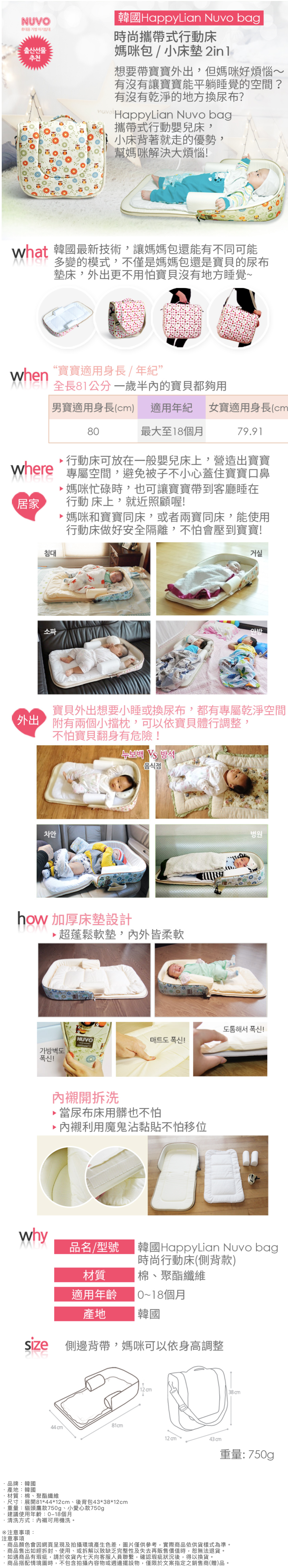 韓國HappyLian Nuvo bag 攜帶式行動嬰兒床,可以當媽媽包,也是寶貝的行動嬰兒床!寶貝臨時需要乾淨地方換尿布,或是想要小睡時,都能馬上變成小床使用,超澎鬆軟墊讓寶寶躺著好舒適!側背包款超大容量可以放入尿布衣物方便媽咪拿東西,超輕量750g,背了就走非常方便!
