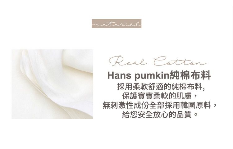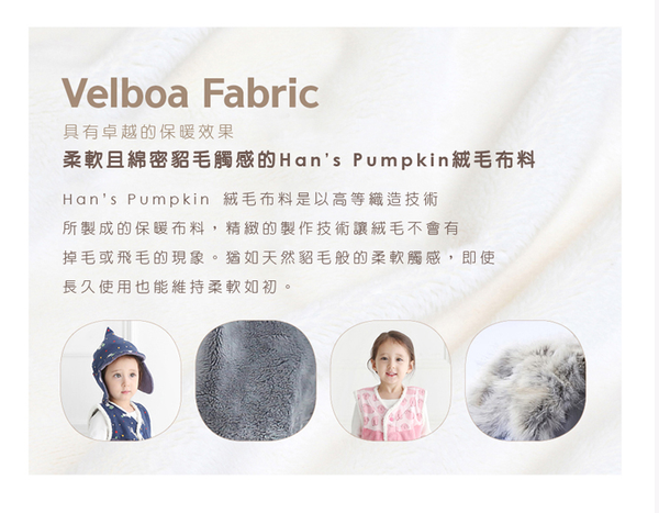 柔軟又綿密的絨毛布料,是 Hans Pumpkin 用精緻的織造技術製成,因此不會有掉毛、飛毛的現象,不只耐穿,而且安全!