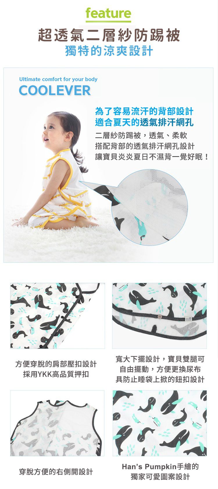 人家說:「囝仔屁股三把火」,尤其寶寶的體溫又比較高,睡覺總愛翻來翻去,常睡一睡也滿頭大汗!而且又到了悶熱的夏天,叡叡的四層紗跟六層紗防踢背心早就穿不住啦!因此這次叡叡媽入手的是更輕薄透氣的 Han's Pumpkin 二層紗防踢背心,夏天時在冷氣房睡覺讓寶寶穿著,不再擔心肚子會著涼了!
