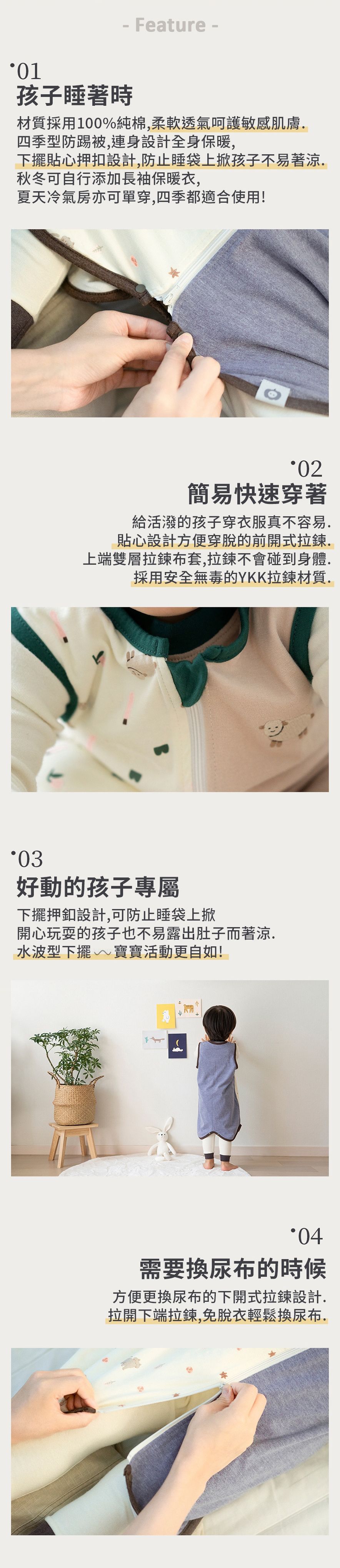 拉鍊是從下方拉開,不怕夾到孩子的下巴,也可以方便媽咪換尿布唷!
