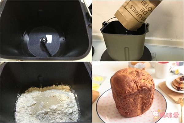 只要先倒水→將麵包預拌粉、酵母粉倒進麵包機→ 選擇喜歡的模式,然後就等著隔天起床吃新鮮烤好的麵包~