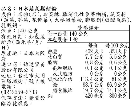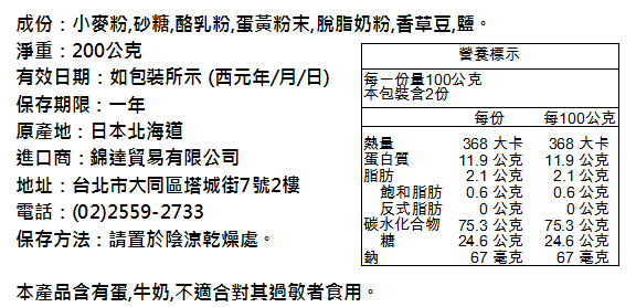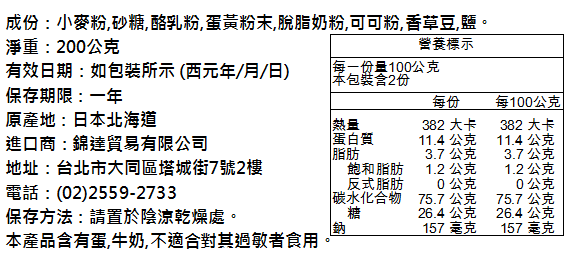 預拌粉成分:小麥、北海道奶粉、植物油、砂糖、蜂蜜粉末、脫脂奶粉、蛋黃、食鹽(本產品含有牛奶,不適合對其過敏體質者食用),產地:日本北海道