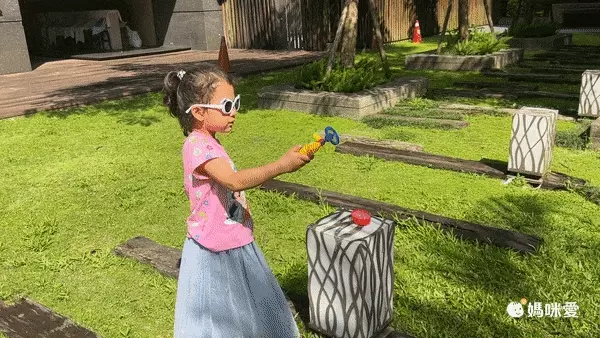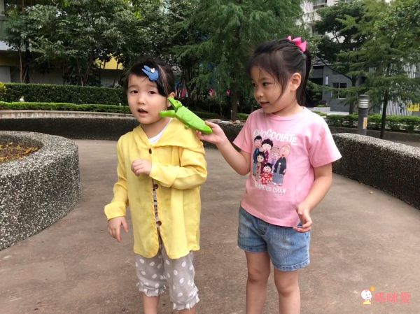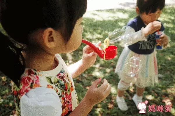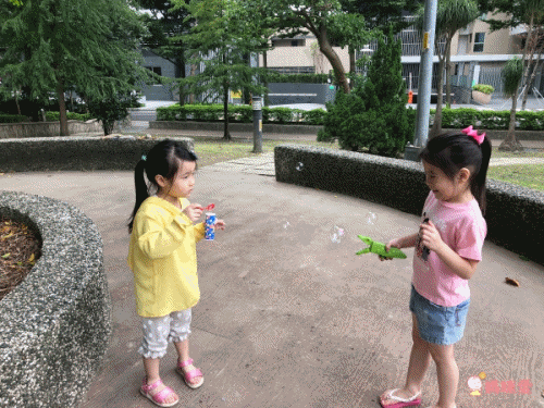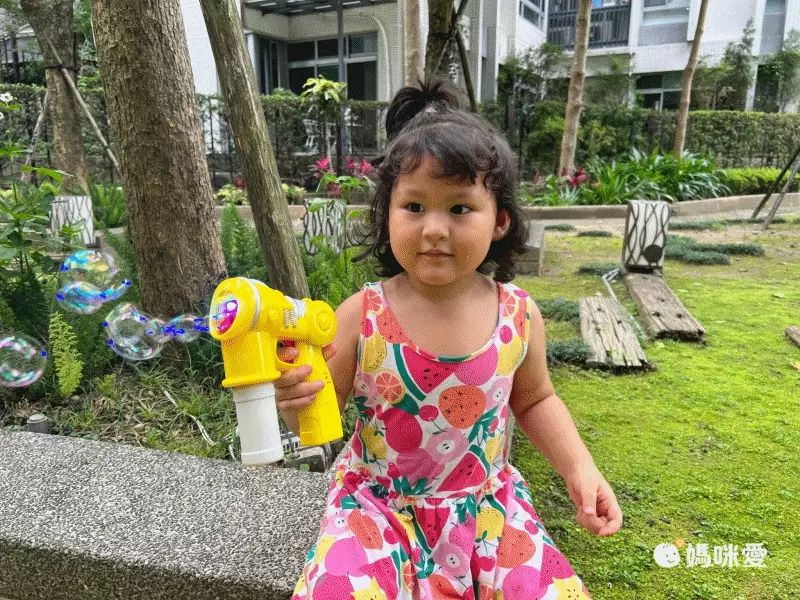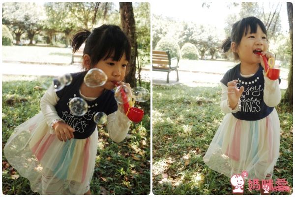 她愛用泡泡竹蜻蜓把大泡泡越吹越高,也會跟妹妹比賽看誰先追到泡泡!