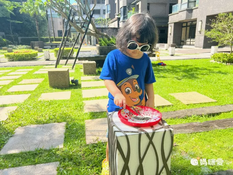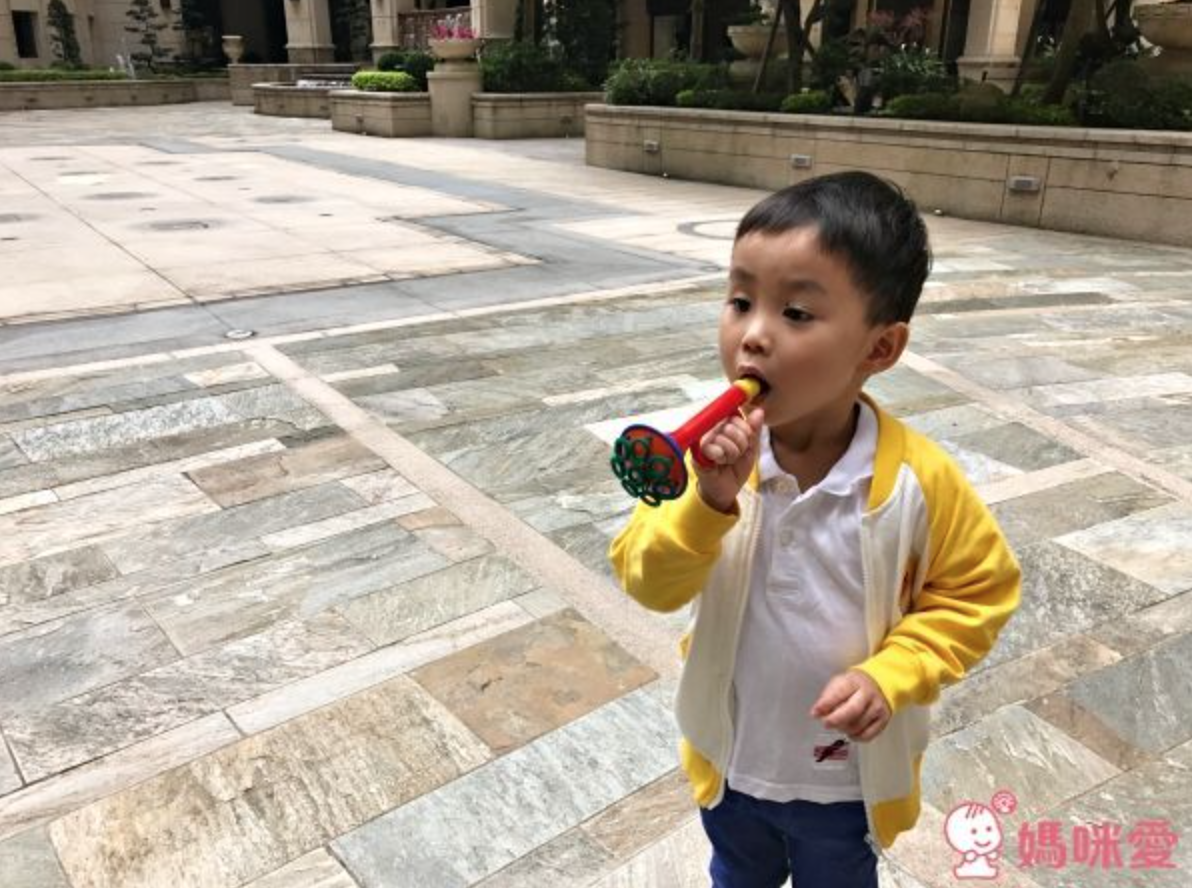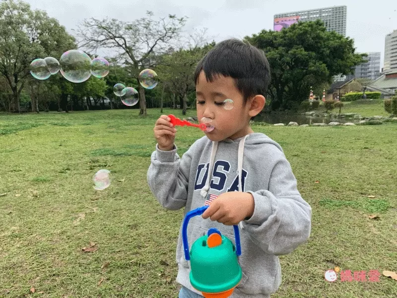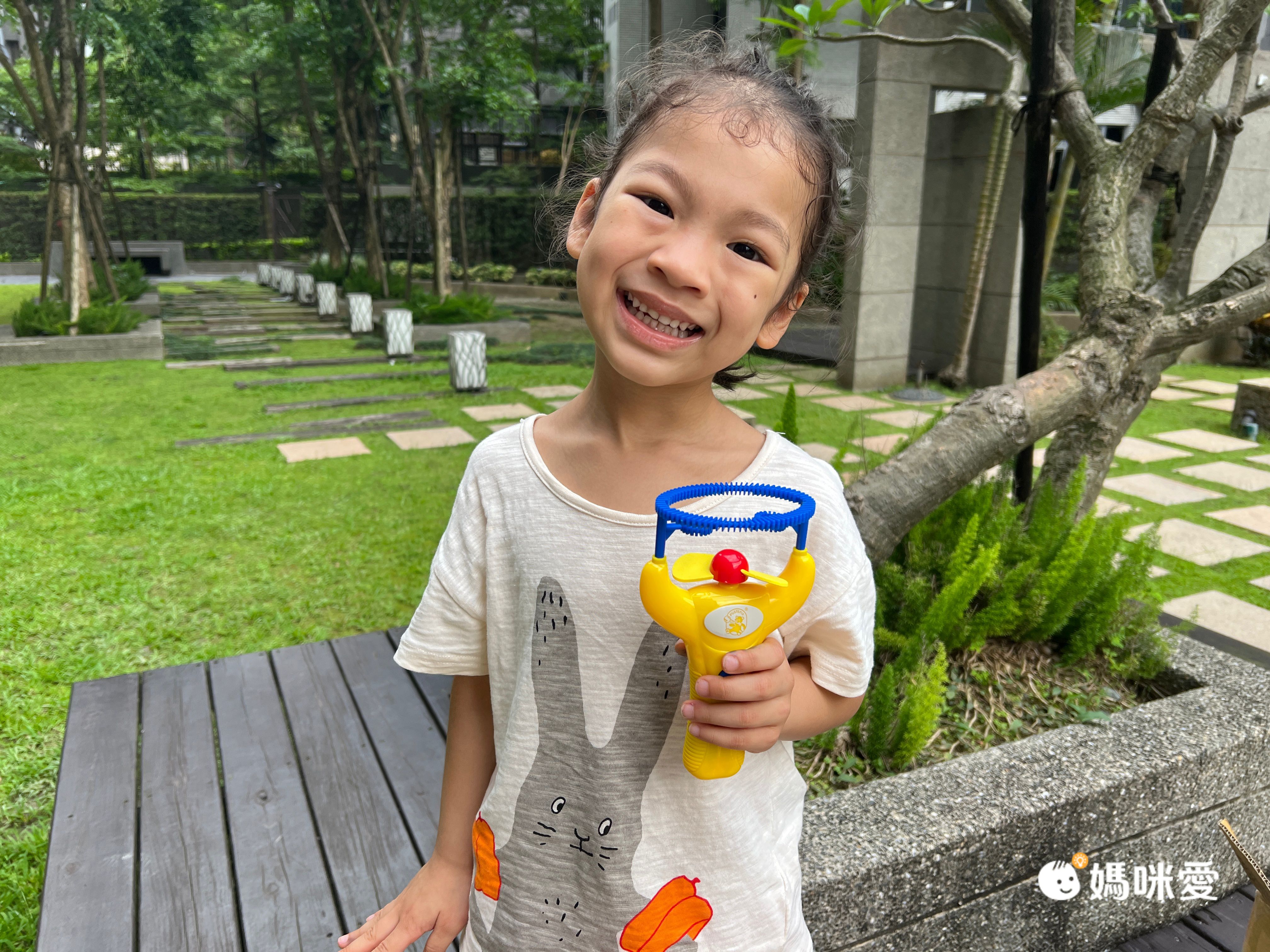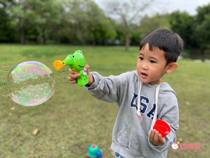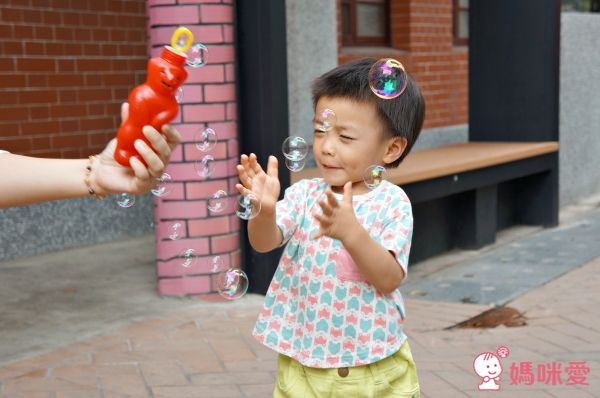 叡叡才兩歲多,其實好不太會控制按壓熊肚跟吹氣的力道,所以如果寶寶未滿三歲,媽咪可以握著手一起按,或是按壓出泡泡環讓寶寶玩喔~