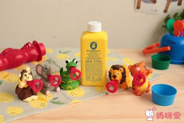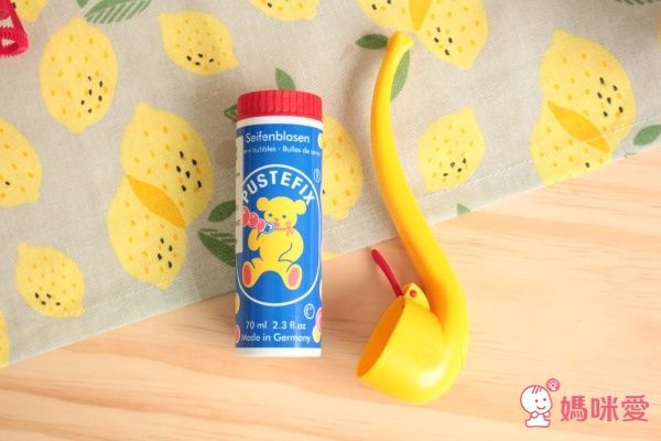 搭配的當然是 Pustefix 通過檢驗的泡泡水囉,薇薇媽真的不敢隨便買路邊十元一罐的泡泡,畢竟玩泡泡多多少少都會沾到手上、皮膚,而小朋友的皮膚很容易過敏或是起疹子,只有確保原料無毒才敢讓薇薇用。